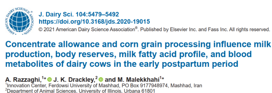 Razzaghi, A., J. Drackley, and M. Malekkhahi, Concentrate allowance and corn grain processing influence milk production, body reserves, milk fatty acid profile, and blood metabolites of dairy cows in the early postpartum period. Journal of Dairy Science, ۲۰۲۱. ۱۰۴(۵): p. ۵۴۷۹-۵۴۹۲.