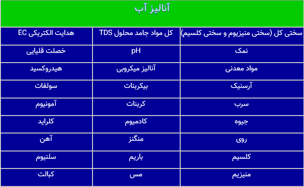 آزمایشهای قابل آنالیز در این بخش برگرفته از منابع معتبر داخلی و بین المللی شامل الزامات سازمان ملی استاندارد، شرکتهای مهندسین مشاور آب و پساب، کلیه کارخانهها و صنایع و ... طراحی و راه اندازی شده است.